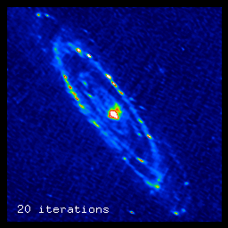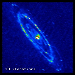 The IRAS "beam" is not Gaussian, nor is the resolution in the image the same across an entire image. HIRES produces beam sample maps ("bem" maps), which show how the achieved resolution depends on source strength and coverage. They consist of a field of point-source spikes superimposed on a highly smoothed version of the image (note: the image smoothing includes attenuation of point-source flux). The user can specify the flux densities of a point source of interest, in Jy, one value per band. The default is 10 Jy in all four bands. A regular grid of 5x5 samples for a 1x1, or 9x9 spikes for a 2x2, square-degree field is used.