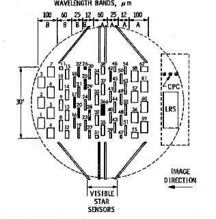 IRAS point sources do not appear circular, primarily because the detector apertures were rectangular. In fact, the PSF of an IRAS source is determined both by the detector mask shape and the geometry of the scans covering the source. Thus, in a raw IRAS image, point sources appear elongated, with the narrow dimension in the scan direction and the larger dimension determined by the cross-scan width of the detector. Click here for an illustration of the focal plane indicating the detector sizes. Near the ecliptic poles, the PSF may even be X-shaped! This is because the survey strategy allowed nearly orthogonal scan directions near the poles. For unenhanced coadded images, the resolution is approximately 1' by 5', 1' by 5', 2' by 5' and 4' by 5' at 12, 25, 60 and 100 µm, respectively. For "medium resolution" images (e.g., the IRAS Sky Survey Atlas (ISSA) all four bands are smoothed to the 100 µm resolution. For HIRES images, the resolution varies in a complicated way. The AC/DC EffectThe IRAS detectors had a dwell-time dependent responsivity change. Hence, the gain changes as a function of source size: at the IRAS survey speed of 3.85 arcminute/s, the gains leveled off for structure on the order of 30' in extent. This effect was band-dependent and largest at 12 µm. Thus, there are two calibrations for the IRAS data, the calibration appropriate for point sources, known as the AC calibration, and the calibration appropriate to very extended structure, known as the DC calibration. To bring point source fluxes measured from DC-calibrated products to the AC (same as the Point Source Catalog V2.0 [PSC2]) calibration, the fluxes must be divided by 0.78, 0.82, 0.92 and 1.0 at 12, 25, 60 and 100 µm, respectively. All non-point-source-filtered IRAS image products produced before April 1993 were DC calibrated. This includes early HIRES and FRESCO images and ISSA. After April 1993, FRESCO and HIRES images were switched to the AC calibration. Point source fluxes obtained by aperture photometry with appropriate background subtraction on AC calibrated images should be consistent with the PSC2. It should be noted that neither calibration is strictly correct for structure on spatial scales intermediate between point sources and 30'. Intermediate-scale corrections must be derived from inspection of the plots in the IRAS Catalogs and Atlases: Explanatory Supplement (1988, ed. C.A. Beichman, G. Neugebauer, H.J. Habing, P.E. Clegg and T.J. Chester, Washington, DC: GPO). Stripes