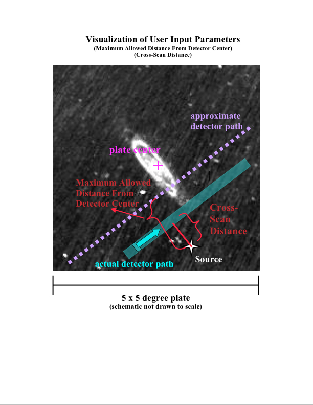 det_distance | Valid range: 0.1 to 3.0 arcmin | 2.2 | Maximum Allowable Distance From Detector Center, in units of arcminutes. This parameter is used in a coarse approximation of all detectors which pass within the allowable distance of the source, using orbit-based parameters and calculation. The next parameter, "Cross Scan Distance", is used as the precise distance a scan can be from the source. Unlike the "Cross Scan Distance" parameter, the precision of this Maximum Allowable Distance From Detector Center can be off by as much as ~0.5 arcmin, and so is a padded value of the next parameter. |